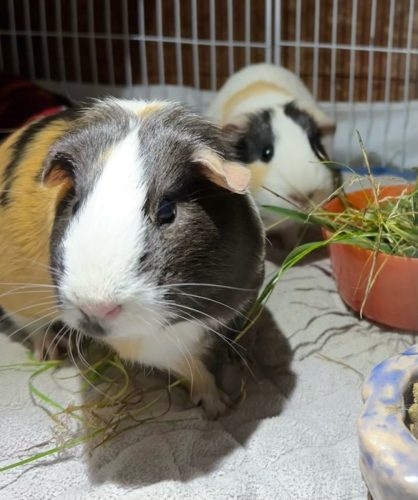 Bobbi (the mum, darker with less white) and S’more (paler coloured daughter) are super sweet girls and welcome us with “reet reet reeeeeet” squeaks. They love to nibble on their Apple tree branches, hay and fresh veggie treats. The girls are still timid but will take treats from a patient hand. When picked up, they will settle and happily snack on treats on a calm lap. The girls are used to dogs too, our motherly mini-labradoodle would sit and watch over them.